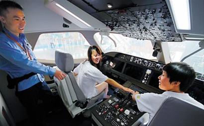鄉(xiāng)村教師孫云霞、孫鳳霞在國產(chǎn)大飛機(jī)樣機(jī)機(jī)艙內(nèi)體驗駕駛操作。 徐瑞哲 攝