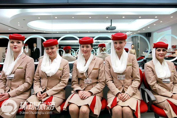 在迪拜的阿聯(lián)酋航空學(xué)院的教室里,空姐們身著制服,姿勢統(tǒng)一,形象俏麗宜人。