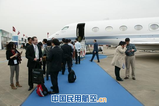 速度最快的灣流飛機(jī)前,參觀的人排長(zhǎng)隊(duì)。攝影:安利國