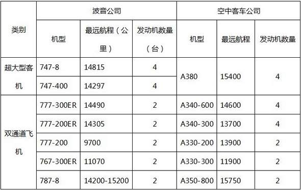根據波音公司和空中客車公司公布的數據,其主要寬體機型的航程數據如下: