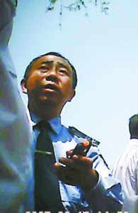第一個趕到現(xiàn)場搶救傷者的他正在向領導匯報當時的情況。記者 陶剛 攝
