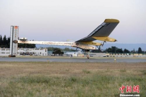 當(dāng)?shù)貢r間5月3日清晨6時12分,美國宇航局位于加州山景城莫菲特機(jī)場,瑞士太陽能飛機(jī)“太陽能驅(qū)動”號起飛,開始?xì)v史性的飛越美國大陸之旅!z影:陳鋼