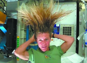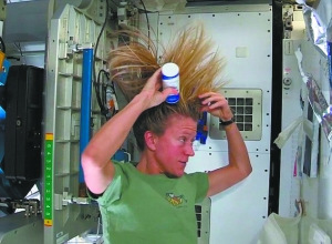 卡倫擁有一頭過肩長(zhǎng)發(fā),在太空里這些頭發(fā)全都豎了起來,顯得“怒發(fā)沖冠”。在國際空間站里,水不會(huì)像地球上那樣從高往低流,而是會(huì)變成無數(shù)小水珠到處亂飄。