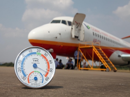 開飛前機(jī)場地面溫度已達(dá)到55攝氏度。