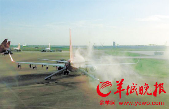 飛機尾部冒出濃煙,應(yīng)急滑梯全部放下,乘客被疏散到停機坪