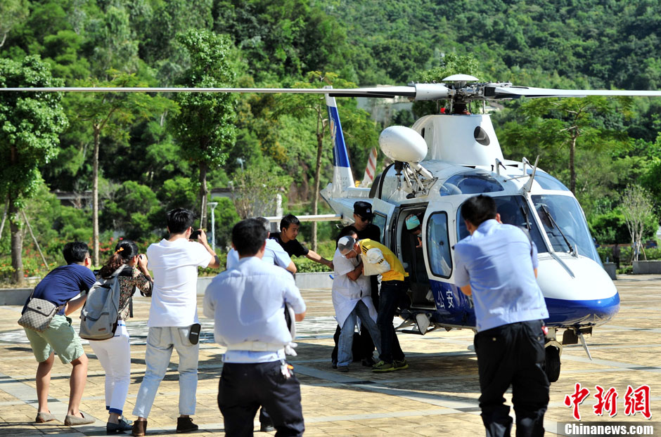 8月27日,深圳市公安局交警支隊在大鵬新區(qū)西涌舉行突發(fā)交通事故應(yīng)急演練。演練模擬該地區(qū)車流量大,發(fā)生事故后該路段出現(xiàn)擁堵,處置和救援人員無法進入事故現(xiàn)場,急調(diào)警用直升機飛赴事故現(xiàn)場進行處置,轉(zhuǎn)移救治“傷員”。中新社發(fā) 陳文 攝