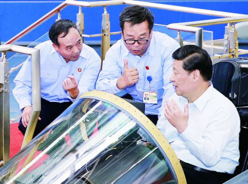 在沈飛,習(xí)近平一行首先觀看了沈飛科研生產(chǎn)紀(jì)錄片《鑄劍》,詳細了解了沈飛軍機型號研制、C919國產(chǎn)大飛機、ARJ21新支線飛機、民機轉(zhuǎn)包項目及歷任國家領(lǐng)導(dǎo)人視察沈飛的情況。習(xí)近平聽取了沈飛科研及批生產(chǎn)飛機性能和研制、民機復(fù)合材料關(guān)鍵技術(shù)研究、激光快速成型技術(shù)及新機快速研制模式等情況介紹,仔細詢問了艦載機及其他飛機研制進展情況,詳細了解飛機空中加油及作戰(zhàn)半徑、武器性能及裝備部隊情況。在生產(chǎn)現(xiàn)場,習(xí)近平饒有興致地登上戰(zhàn)機,進入座艙,詢問、了解飛機操作要領(lǐng)及座艙布局情況,并向周圍員工揮手致意。