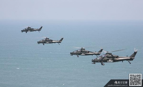 中國陸航武直-10進(jìn)行海上編隊(duì)超低空突防演練。(司啟富攝)
