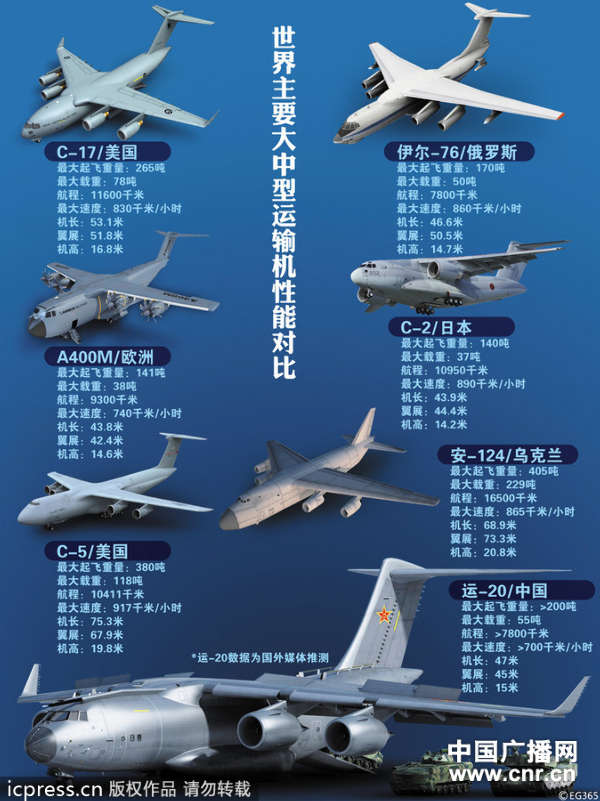 “運(yùn)-20”,機(jī)體長(zhǎng)47米,翼展45米,高15米,實(shí)用升限是13000米,最高載重量是66噸,最大起飛重量220噸,因此躋身全球十大運(yùn)力最強(qiáng)運(yùn)輸機(jī)之列!斑\(yùn)-20”的首次飛意味著中國(guó)空軍向戰(zhàn)略空軍邁出了堅(jiān)實(shí)的一步。