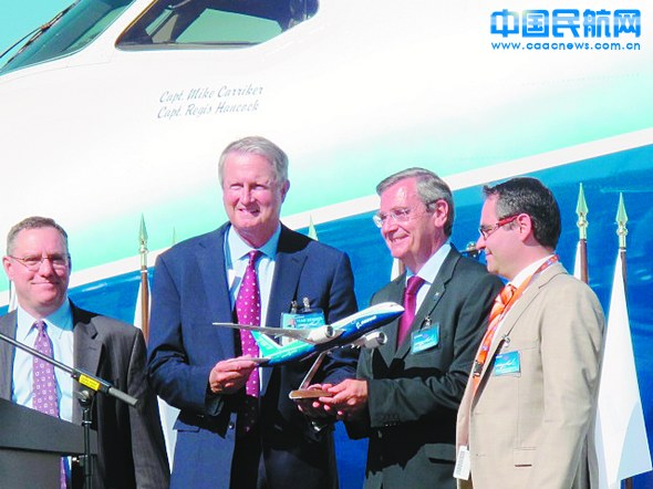 去年8月26日,波音獲頒波音787型號生產(chǎn)認證證書后,安波杰(左二)向歐洲安全局局長(右二)贈送波音787模型。 (劉樹國/攝)