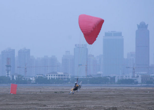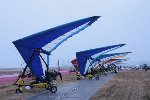 在?谑腥f綠園后觀海臺賽點,動力懸掛滑翔機整裝待發(fā)