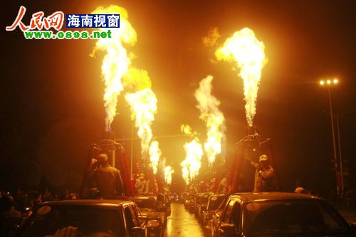 26日晚8點(diǎn)左右,2011環(huán)海南島飛行拉力賽萬(wàn)寧段的首場(chǎng)活動(dòng)——熱氣球噴火表演游行在萬(wàn)寧市區(qū)上演。當(dāng)晚,萬(wàn)寧市區(qū)飄起了毛毛細(xì)雨,20個(gè)熱氣球組成的方陣從萬(wàn)寧市人民中路與萬(wàn)州大道交叉路口出發(fā),以人民公園為終點(diǎn)。在充滿動(dòng)感的音樂(lè)聲中,熱氣球進(jìn)行了多種樣式的噴火表演,交叉噴射,雙向噴射,搖擺噴射……整齊劃一的火柱照亮了萬(wàn)寧的夜空,熾熱耀眼的火焰蒸發(fā)了綿綿的細(xì)雨。眾多萬(wàn)寧市民早早守候在萬(wàn)州大道兩旁,欣賞這難得一見(jiàn)的場(chǎng)景。方陣經(jīng)過(guò)的每個(gè)地方都引起尖叫聲一片,整條街道歡樂(lè)的氣氛達(dá)到了沸點(diǎn)。