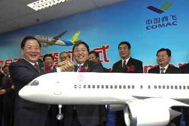 2月14日,中國商飛公司董事長金壯龍(前左)與中銀航空租賃董事長陳四清(前右)在新加坡出席C919客機啟動用戶協(xié)議。