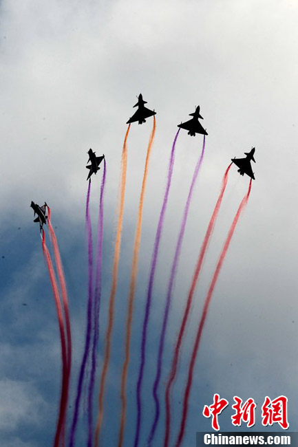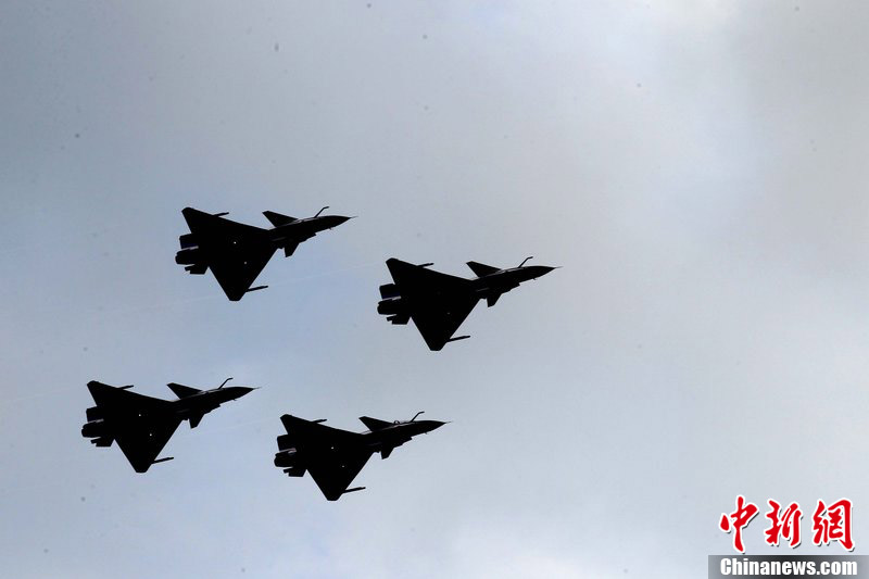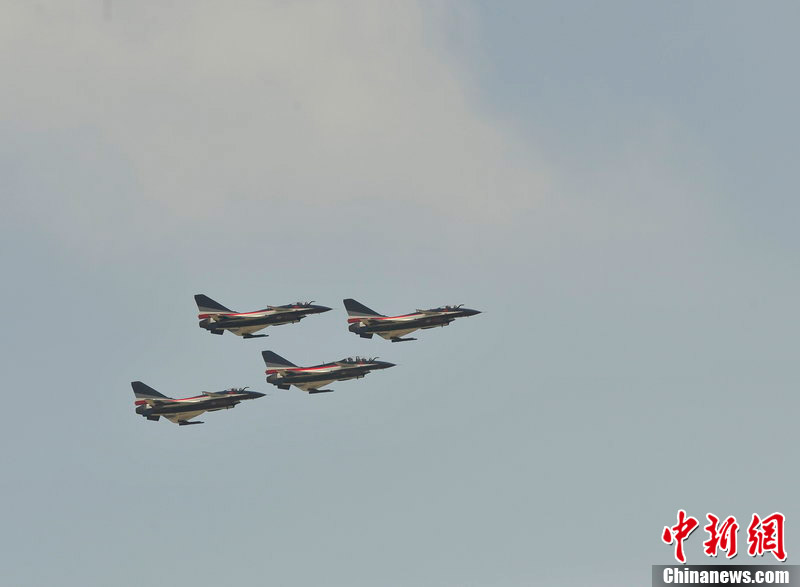 2012年11月10日,廣東省珠海市,八一飛行表演隊殲十戰(zhàn)機做編隊飛行練習。八一飛行表演隊將在珠海航展上做精彩編隊飛行表演。
