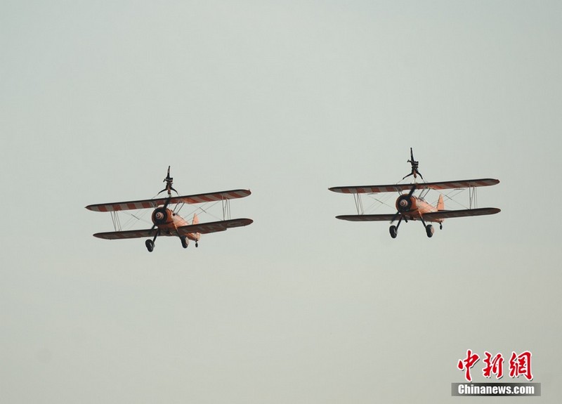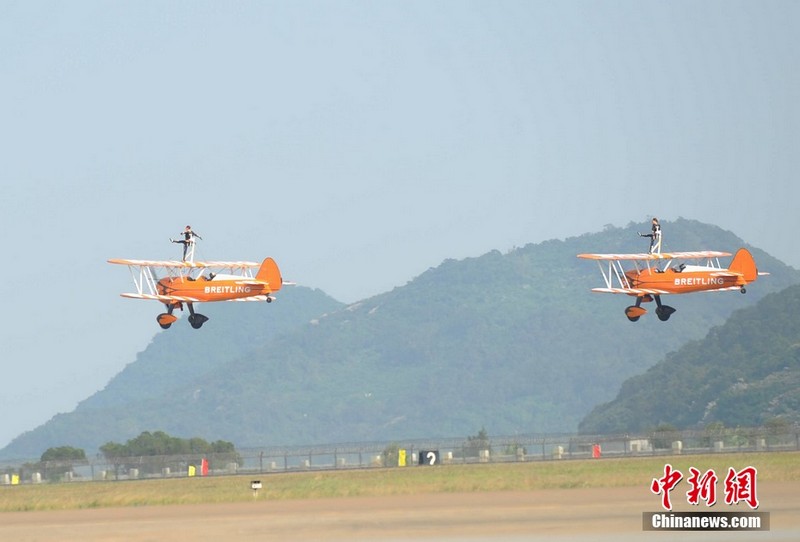 11月11日下午,歐洲“百年靈”機翼行走飛行表演隊表演了精彩的“云中漫步”。兩架飛機上各站有一名美女,在空中表演獨門舞步和雜技,隨飛機一起“云中漫步”,優(yōu)雅精準!
