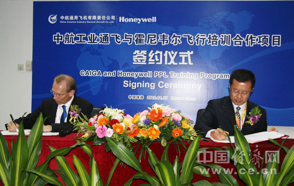 中國經(jīng)濟網(wǎng)珠海航展特派記者團 記者王飛11月16日報道 15日,中航通用飛機有限責(zé)任公司(以下簡稱“中航工業(yè)通飛”)副總經(jīng)理、珠海中航飛行學(xué)校有限公司董事長沙長安與霍尼韋爾航空航天(簡稱“霍尼韋爾公司”)亞太區(qū)總裁Briand Greer簽署了“飛機5用駕駛員駕照(PPL)項目合作備忘錄”。這標(biāo)志著中航工業(yè)通飛下屬的珠海中航飛行學(xué)校向霍尼韋爾公司的工程技術(shù)人員和管理人員提供飛行培訓(xùn)服務(wù)的工作進入實施階段。