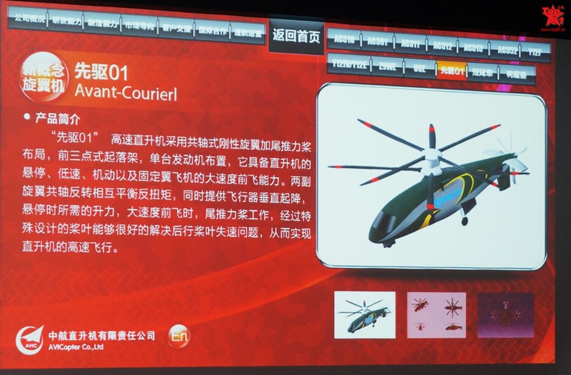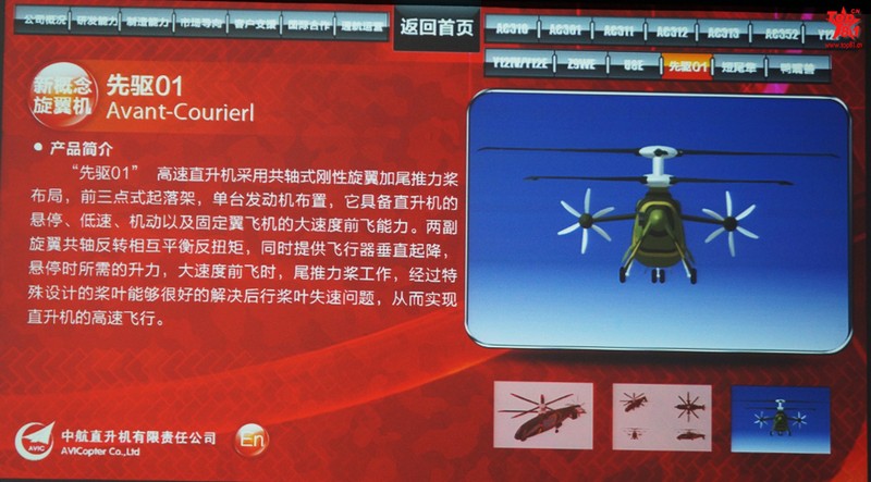 人民網(wǎng)北京11月9日電 (記者 楊鐵虎)中航工業(yè)直升機(jī)公司將在第九屆中國航展上展出“先驅(qū)01”新概念高速直升機(jī)模型。9日下午,中航工業(yè)直升機(jī)公司的專家向人民網(wǎng)記者介紹說,“先驅(qū) 01”新概念高速直升機(jī)采用共軸式剛性旋翼加尾推力槳布局,前三點(diǎn)式起落架,單臺發(fā)動機(jī)布置。具備直升機(jī)的懸停、低速、機(jī)動以及固定翼飛機(jī)的大速度前飛能力。
