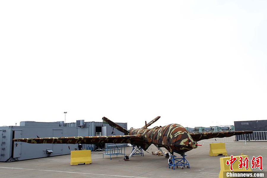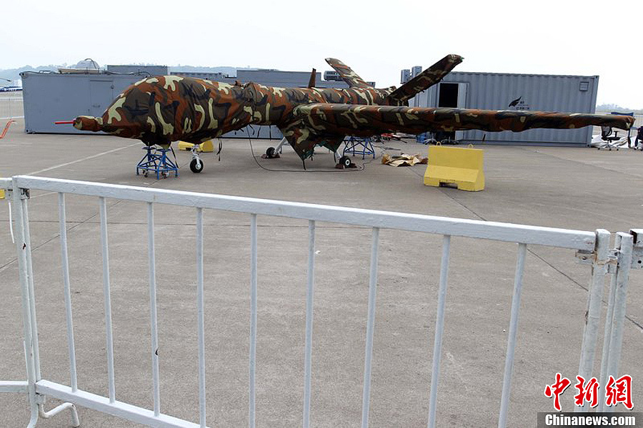 曾在前兩屆珠海航展上展出模型的翼龍無人機(jī),在今年航展上以實(shí)物參展。11月8日,該機(jī)已經(jīng)組裝完畢停放在展坪上。該款無人機(jī)由中航工業(yè)旗下成都飛機(jī)設(shè)計(jì)研究所研制,該機(jī)裝有一臺(tái)100馬力活塞發(fā)動(dòng)機(jī),具備全自主平輪式起降和飛行能力,最大起飛重量達(dá)1100公斤,最大續(xù)航時(shí)間為20個(gè)小時(shí),可攜帶各種偵察、激光照射/測(cè)距、電子對(duì)抗設(shè)備及小型空地打擊武器,可執(zhí)行監(jiān)視、偵查及對(duì)地攻擊任務(wù)等任務(wù),也可用于維穩(wěn)、反恐、邊界巡邏等。