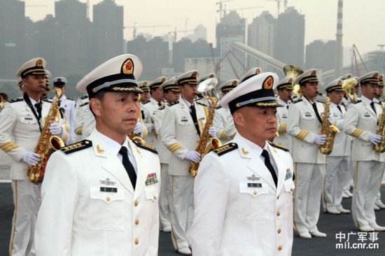 中國第一艘航空母艦遼寧艦艦長張崢(前右)政委梅文(前左)