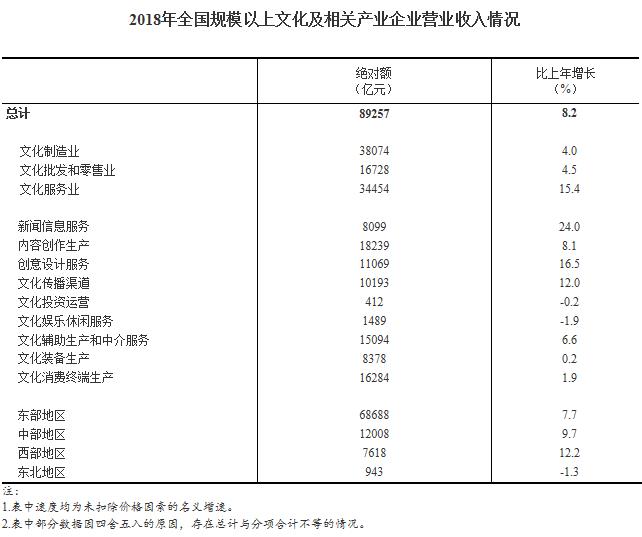 經(jīng)濟日報-中國經(jīng)濟網(wǎng)北京1月31日訊 今天,國家統(tǒng)計局公布了2018年規(guī)模以上文化及相關(guān)產(chǎn)業(yè)生產(chǎn)經(jīng)營季度報告。報告顯示,據(jù)對全國規(guī)模以上文化及相關(guān)產(chǎn)業(yè)6.0萬家企業(yè)調(diào)查,2018年,上述企業(yè)實現(xiàn)營業(yè)收入89257億元,比上年增長8.2% (按可比口徑計算。為名義增長,未扣除價格因素。按照《文化及相關(guān)產(chǎn)業(yè)分類(2018)》新標準測算,上述企業(yè)2017年實現(xiàn)的營業(yè)收入為82456億元。)。