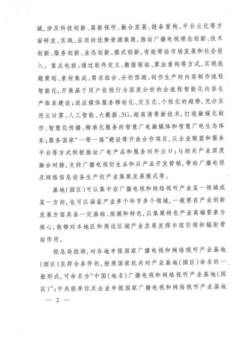 國家廣播電視和網絡視聽產業(yè)基地(園區(qū))由國家廣播電視總局(以下簡稱“總局”)命名,主要體現在廣播電視和網絡視聽內容制作、分發(fā)傳播、用戶服務、技術支撐、生態(tài)建設以及運營管理等領域,涉及科技創(chuàng)新、高新視聽、融合發(fā)展、鏈條重構、平臺云化等方面研發(fā)、實踐、應用的優(yōu)勢資源集聚,推動廣播電視理念創(chuàng)新、技術創(chuàng)新、服務創(chuàng)新、業(yè)態(tài)創(chuàng)新、模式創(chuàng)新,有效帶動市場發(fā)展和社會投入。重點包括:通過軟件定義、數據驅動、算法重構等方式,實現選題策劃、素材集成、需求組合、分析預測、創(chuàng)作生產的內容制作流程智能化,開展基于用戶收視行為深度分析的全流程智能化內容生產體系建設;適應媒體服務移動化、交互化、個性化的趨勢,充分應用云計算、人工智能、大數據、5G、超高清等新技術,打造融媒化制作、智慧化傳播、精準化服務的智慧廣電融媒體和智慧廣電生態(tài)體系;服務國家“一帶一路”建設等開放合作項目,以企業(yè)聯盟和服務平臺等方式積極推動廣電產品和服務對外出口;與相關產業(yè)深度融合對接,支持廣播電視衍生品和后產品開發(fā)營銷,帶動廣播電視及網絡信息設備生產的產業(yè)集聚發(fā)展模式等。