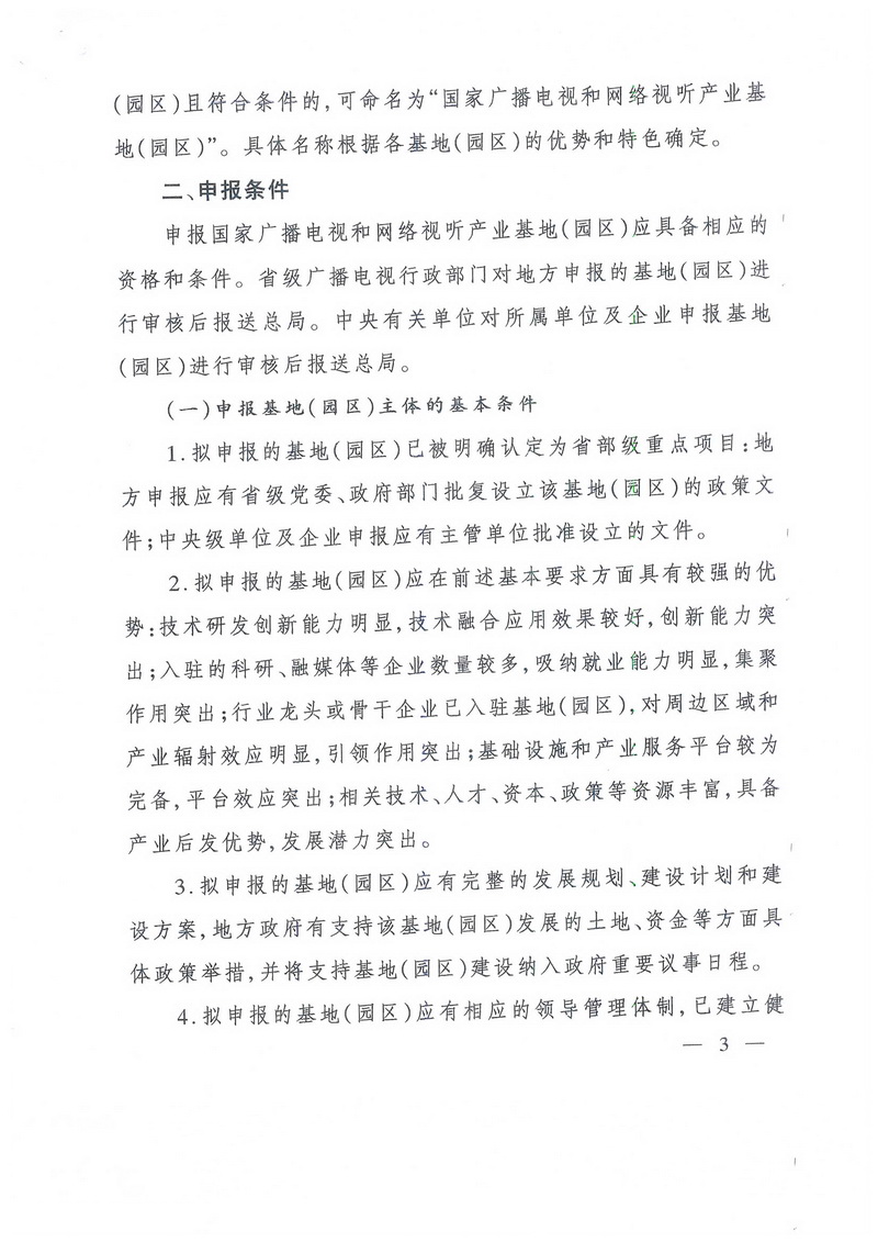 申報國家廣播電視和網絡視聽產業(yè)基地(園區(qū))應具備相應的資格和條件。省級廣播電視行政部門對地方申報的基地(園區(qū))進行審核后報送總局。中央有關單位對所屬單位及企業(yè)申報基地(園區(qū))進行審核后報送總局。