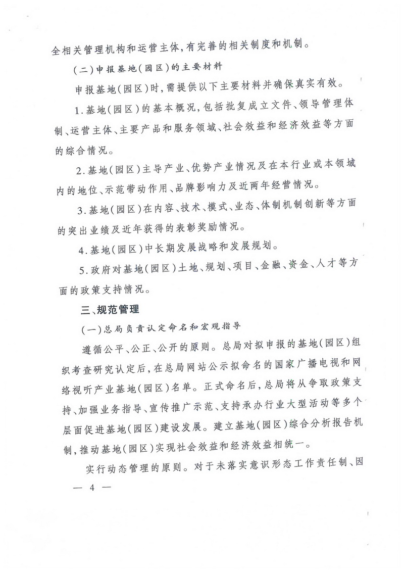 對總局此前已經命名的基地(園區(qū)),屬于廣播電視和網絡視聽方面的,要進行全面梳理,按本通知精神納入統籌管理,推動轉型升級,并按上述時間要求報送年度發(fā)展情況報告。