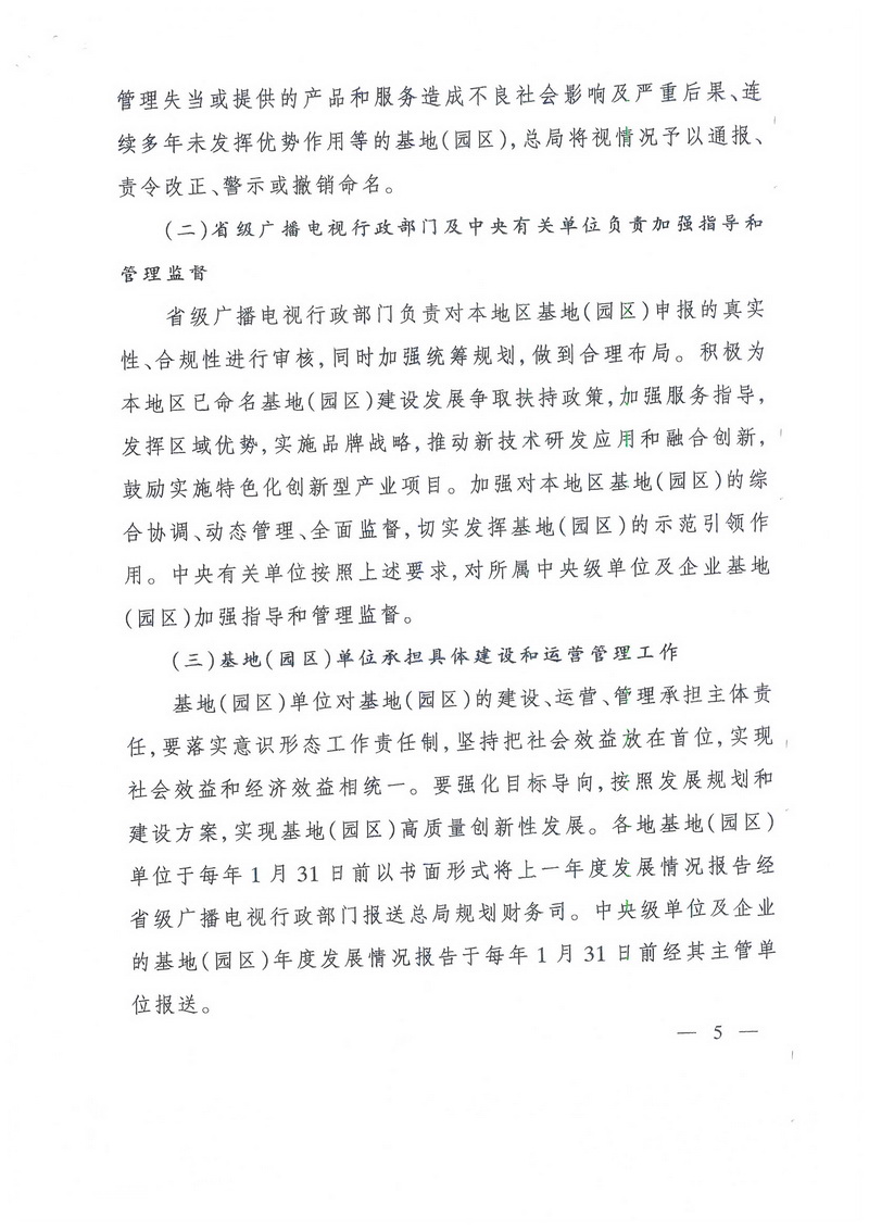 基地(園區(qū))單位對基地(園區(qū))的建設、運營、管理承擔主體責任,要落實意識形態(tài)工作責任制,堅持把社會效益放在首位,實現社會效益和經濟效益相統一。要強化目標導向,按照發(fā)展規(guī)劃和建設方案,實現基地(園區(qū))高質量創(chuàng)新性發(fā)展。各地基地(園區(qū))單位于每年1月31日前以書面形式將上一年度發(fā)展情況報告經省級廣播電視行政部門報送總局規(guī)劃財務司。中央級單位及企業(yè)的基地(園區(qū))年度發(fā)展情況報告于每年1月31日前經其主管單位報送。