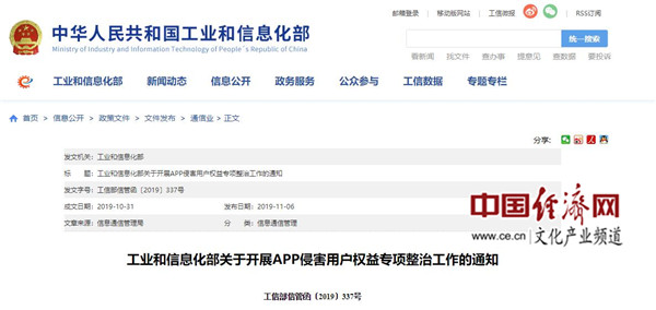 經(jīng)濟日報-中國經(jīng)濟網(wǎng)北京11月26日訊 日前,工業(yè)和信息化部發(fā)布《關(guān)于開展APP侵害用戶權(quán)益專項整治工作》的通知,《通知》稱,鑒于當前APP違規(guī)收集個人信息、過度索權(quán)、頻繁騷擾、侵害用戶權(quán)益等問題突出將開展專項整治工作,專項整治工作時間將一直持續(xù)至2019年12月20日。