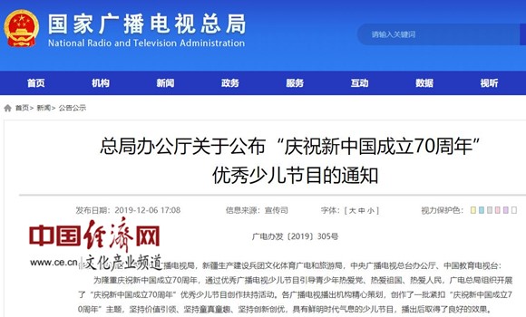 經(jīng)濟(jì)日?qǐng)?bào)-中國經(jīng)濟(jì)網(wǎng)北京12月9日訊 近日,國家廣播電視總局辦公廳發(fā)布關(guān)于公布“慶祝新中國成立70周年”優(yōu)秀少兒節(jié)目的通知。據(jù)經(jīng)濟(jì)日?qǐng)?bào)-中國經(jīng)濟(jì)網(wǎng)文化產(chǎn)業(yè)頻道(微信號(hào):cewenhua)了解,為慶祝新中國成立70周年,通過優(yōu)秀廣播電視少兒節(jié)目引導(dǎo)青少年熱愛黨、熱愛祖國、熱愛人民,廣電總局組織開展了“慶祝新中國成立70周年”優(yōu)秀少兒節(jié)目創(chuàng)作扶持活動(dòng)。近期,經(jīng)各省級(jí)廣電行政管理部門、中央廣播電視總臺(tái)推薦,廣電總局組織專家評(píng)審,最終評(píng)選出中央廣播電視總臺(tái)《童聲飄過70年》、貴陽廣播電視臺(tái)《紅帆船—我們家的國慶節(jié)》等36個(gè)優(yōu)秀廣播電視少兒節(jié)目,廣電總局決定予以通報(bào)表彰,并給予資金扶持。扶持資金由廣電總局下?lián)苤粮魇V播電視局和中央廣播電視總臺(tái),各省局和中央廣播電視總臺(tái)負(fù)責(zé)將扶持資金分發(fā)至所屬獲獎(jiǎng)單位。>>>更多政策可查看中國經(jīng)濟(jì)網(wǎng)“中國文化產(chǎn)業(yè)政策庫”