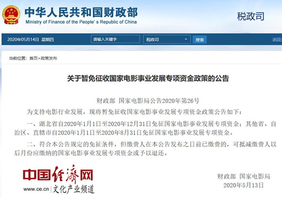 經(jīng)濟日報-中國經(jīng)濟網(wǎng)北京5月14日訊 2020年5月13日,財政部、國家電影局發(fā)布《關(guān)于暫免征收國家電影事業(yè)發(fā)展專項資金政策的公告》。據(jù)經(jīng)濟日報-中國經(jīng)濟網(wǎng)文化產(chǎn)業(yè)頻道(微信號:cewenhua)了解,財政部、國家電影局為支持電影行業(yè)發(fā)展,湖北省自2020年1月1日至2020年12月31日免征國家電影事業(yè)發(fā)展專項資金;其他省、自治區(qū)、直轄市自2020年1月1日至2020年8月31日免征國家電影事業(yè)發(fā)展專項資金。符合規(guī)定的免征條件,但繳費人在公告發(fā)布之日前已繳費的,可抵減繳費人以后月份應(yīng)繳納的國家電影事業(yè)發(fā)展專項資金或予以退還。>>>更多政策可查看中國經(jīng)濟網(wǎng)“中國文化產(chǎn)業(yè)政策庫”