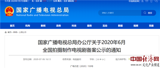 經(jīng)濟(jì)日報-中國經(jīng)濟(jì)網(wǎng)北京7月7日訊 7月6日,國家廣播電視總局公布了6月份全國電視劇拍攝制作備案公示情況,據(jù)悉,6月份全國電視劇拍攝制作備案公示的劇目共61部、2019集。