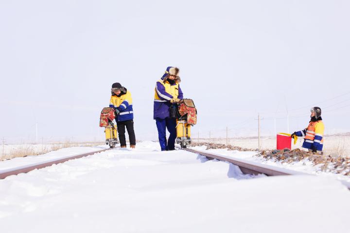 通遼工務(wù)段探傷車間路軌二工區(qū)負責(zé)通霍線以及錫烏線、霍白線等西部線路1000余公里的鋼軌探傷作業(yè),面對通霍及西部鐵路草原地區(qū)海拔高、紫外線強度高、晝夜溫差大、 “白毛風(fēng)”肆虐等特點,“鋼軌醫(yī)生”沒有怨言始終堅守,確保旅客列車及貨物列車的安全運行?!敖裉烊蝿?wù)重,積雪厚,大家多留神!”班長郭夢楠緊了緊防寒帽,呼出的白氣瞬間凝結(jié)。他和工友們抬著80多斤重的路軌超聲波探傷儀,深一腳淺一腳地踩在積雪中,每走一步都需用力拔腿。