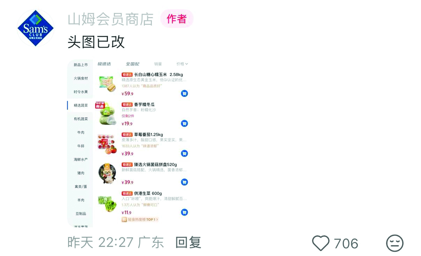 “本次APP的改動(dòng)于今年8月底開(kāi)始上線(xiàn)進(jìn)行測(cè)試,并在期間持續(xù)根據(jù)會(huì)員的反饋進(jìn)行優(yōu)化。這兩天我們陸續(xù)收到了更多來(lái)自會(huì)員關(guān)于商品圖片等方面的寶貴建議,我們將會(huì)持續(xù)改進(jìn),以更好地展現(xiàn)商品的真實(shí)形態(tài)并提升體驗(yàn)。我們始終珍視會(huì)員的聲音,歡迎大家在‘山姆APP—我的—用戶(hù)調(diào)研—商品詳情頁(yè)調(diào)研’持續(xù)給予反饋。感謝大家的支持?!背酥?,山姆還在評(píng)論區(qū)配圖稱(chēng):“頭圖已改?!?/p>
