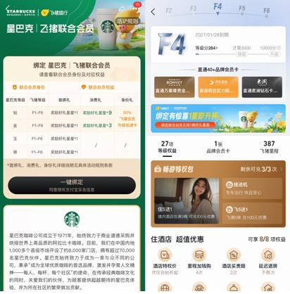 以星巴克中國(guó)鉆星會(huì)員為例,在領(lǐng)取飛豬會(huì)員權(quán)益后,可直接匹配飛豬F4會(huì)員等級(jí),直通超40大牌會(huì)員,含超30家旅行大牌的金卡及以上會(huì)籍,包括萬豪旅享家金卡、雅高心悅界白金卡體驗(yàn)、長(zhǎng)隆歡享家鉑金卡、皇家加勒比游輪游享薈精英會(huì)員等。這意味著,獲得飛豬會(huì)員身份的星巴克中國(guó)會(huì)員在飛豬平臺(tái)消費(fèi)這些品牌的服務(wù)時(shí),既可獲得飛豬會(huì)員權(quán)益,也可同步獲得來自旅行品牌的會(huì)員權(quán)益。