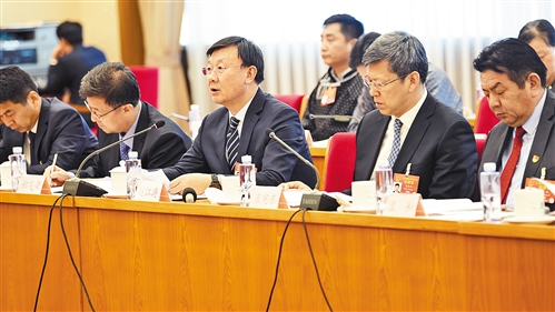 上圖 3月12日,人大內(nèi)蒙古代表團(tuán)舉行全體會議。全國人大代表、內(nèi)蒙古自治區(qū)包頭市市長趙江濤(中)表示,生態(tài)文明建設(shè)利國利民。 本報記者 李景錄攝