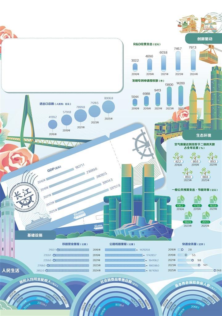 高水平開放新格局加快形成。圍繞打造內(nèi)陸國(guó)際物流樞紐和口岸高地,重慶持續(xù)推動(dòng)高水平對(duì)外開放。2025年,重慶港口貨物吞吐量突破2.4億噸,較10年前增長(zhǎng)50%,西部陸海新通道江津班列開行量2199列,運(yùn)輸貨物11萬(wàn)標(biāo)箱、同比增長(zhǎng)22%。