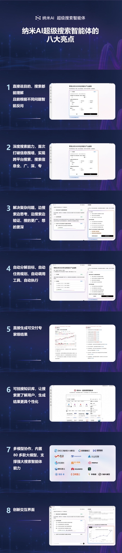 周鴻祎介紹,納米AI超級搜索智能體有八大核心亮點:降低搜索門檻,精準理解需求,支持自然語言提問,且能根據不同問題實現智能反問;利用深度搜索(Deep Search)能力打破信息圍墻,實現小紅書、抖音、淘寶、京東、雪球等不同平臺跨平臺搜索,深度理解網頁中的表格、公式、音視頻、評論彈幕等;邊搜索邊思考,邊搜索邊驗證,在處理購物比價、租房買房、投資建議等復雜問題時,它會綜合分析多個信息源,對信息進行交叉驗證,避免單一信息源的片面性,為用戶提供可靠的決策依據;能自動分解目標,自動任務規(guī)劃,自動調用工具,自動執(zhí)行。例如,在生成調研報告時,它會自主規(guī)劃流程,并分解成資料收集、數據分析、報告撰寫等任務,調用網頁搜索、數據處理軟件等工具,最終交付高質量的調研報告;可直接生成可交付的專家級結果,支持多種生活工作高頻格式輸出,如Word、PPT、Excel、動態(tài)網頁、視頻等;可掛接知識庫,讓搜索更加了解用戶,使生成結果更具個性化;內置國內80多款大模型,能夠綜合不同模型的優(yōu)勢,針對不同類型的問題,選擇最合適的模型或模型組合進行處理;工作流程全程可視化。用戶可以清晰看到智能體在處理問題時的每一個步驟,包括信息搜索路徑、工具調用情況等,確保關鍵決策可控。