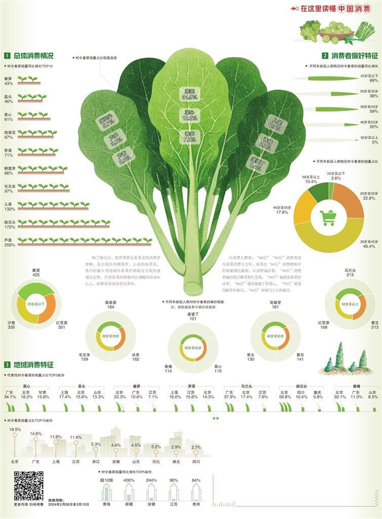 受氣溫偏暖影響,今年春菜提前了半個月左右上市,春菜消費(fèi)較早升溫。數(shù)據(jù)顯示,薺菜、菜心、春筍、兒菜、豌豆尖、蘆筍、蘆蒿、香椿、婆婆丁成為線上熱銷春菜。其中,蘆蒿、豌豆尖、兒菜銷量分別同比增長250%、172%、132%。