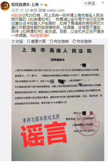 經(jīng)濟(jì)日?qǐng)?bào)-中國(guó)經(jīng)濟(jì)網(wǎng)2月22日訊 (記者 朱國(guó)旺 郭文培) 2月20日晚,網(wǎng)上流傳一張所謂上海市高級(jí)人民法院開(kāi)具的《扣押通知書(shū)》,稱青浦公安分局于當(dāng)日(20日)在花橋收費(fèi)處設(shè)卡檢查入滬車輛時(shí),扣押了青浦某藥房購(gòu)買的大量紅外額溫槍等防疫保障物資。
