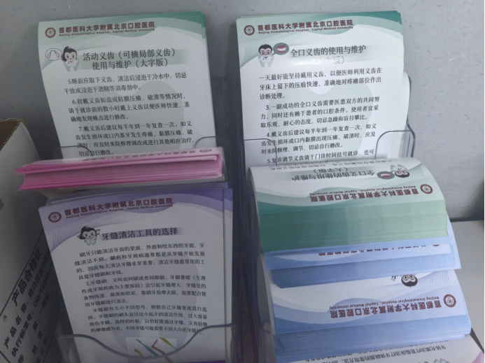 記者走進(jìn)北京口腔醫(yī)院門(mén)診樓,綠色的“老年咨詢臺(tái)”標(biāo)示映入眼簾。老年咨詢臺(tái)正前方走20米,左手邊便是老年口腔病科。順著黃色地標(biāo)徑直走約30米,便到達(dá)分診臺(tái)。上午的分診臺(tái)前,是患者最多的時(shí)候,詢問(wèn)聲和指引聲交織,忙而有序。分診臺(tái)一角的老花鏡和大字版宣教彩頁(yè)引人矚目。護(hù)士告訴記者,這是為老年患者特意準(zhǔn)備的。“科室建的時(shí)間長(zhǎng),我們也準(zhǔn)備搬新院了,雖然地方有點(diǎn)局促,但該有的硬件都有?!?/p>