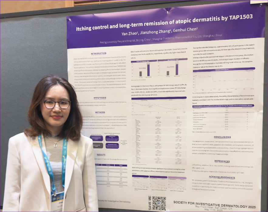 2025年第82屆美國皮膚病研究學會年會(SID)于5月7日至10日在美國圣地亞哥舉行,來自北京大學人民醫(yī)院趙琰教授關(guān)于澤立美本維莫德乳膏治療特應性皮炎的確證性臨床研究數(shù)據(jù)重磅亮相本次年會。這是首個且唯一針對中國人群的研究,展示了澤立美本維莫德乳膏在速效止癢、療效持久及安全性方面的顯著優(yōu)勢。