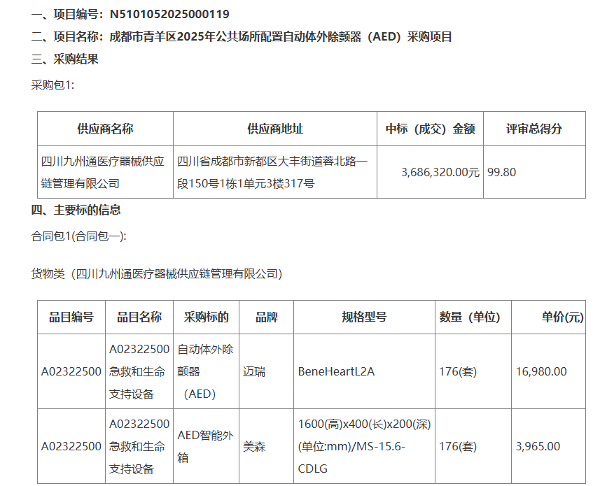 公告顯示,四川九州通醫(yī)療器械供應(yīng)鏈管理有限公司以99.80的評審總得分中標(biāo),中標(biāo)(成交)金額為3686320.00元,將供應(yīng)176(套)邁瑞公司的自動體外除顫器(AED),單價為16980.00元;供應(yīng)176(套)美森公司的AED智能外箱,單價為3965.00元。
