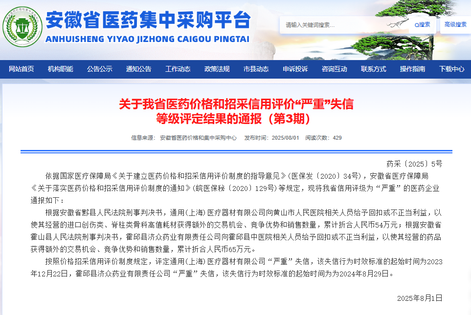 通報(bào)顯示,根據(jù)安徽省黟縣人民法院刑事判決書(shū),通用(上海)醫(yī)療器材有限公司向黃山市人民醫(yī)院相關(guān)人員給予回扣或不正當(dāng)利益,以使其經(jīng)營(yíng)的進(jìn)口創(chuàng)傷類(lèi)、脊柱類(lèi)骨科高值耗材獲得額外的交易機(jī)會(huì)、競(jìng)爭(zhēng)優(yōu)勢(shì)和銷(xiāo)售數(shù)量,累計(jì)折合人民幣54萬(wàn)元;按照價(jià)格招采信用評(píng)價(jià)制度規(guī)定,評(píng)定通用(上海)醫(yī)療器材有限公司“嚴(yán)重”失信,該失信行為時(shí)效標(biāo)準(zhǔn)的起始時(shí)間為2023年12月22日。