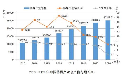 根據(jù)“傳媒藍(lán)皮書”課題組的統(tǒng)計(jì),2000年中國(guó)傳媒產(chǎn)業(yè)總產(chǎn)值只有1500億元,2013年突破了1萬億元,2018年突破了2萬億元,2020年雖受疫情影響但依然正向增長(zhǎng)根據(jù)“傳媒藍(lán)皮書”課題組的統(tǒng)計(jì),2020年中國(guó)傳媒產(chǎn)業(yè)總產(chǎn)值達(dá)25229.7億元,同比增長(zhǎng)6.51%,雖然增長(zhǎng)率較2019年下跌3.3個(gè)百分點(diǎn),但依然高于GDP增長(zhǎng)率。傳媒細(xì)分領(lǐng)域呈現(xiàn)兩極化發(fā)展態(tài)勢(shì),報(bào)刊、圖書、電影等傳統(tǒng)領(lǐng)域業(yè)務(wù)受疫情影響收入有所下降,但網(wǎng)絡(luò)視聽、網(wǎng)絡(luò)廣告、網(wǎng)絡(luò)游戲等互聯(lián)網(wǎng)業(yè)務(wù)在疫情背景下的“宅經(jīng)濟(jì)”中卻呈超常發(fā)展態(tài)勢(shì)。