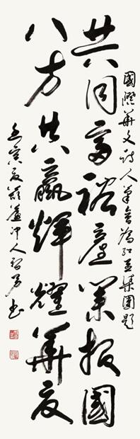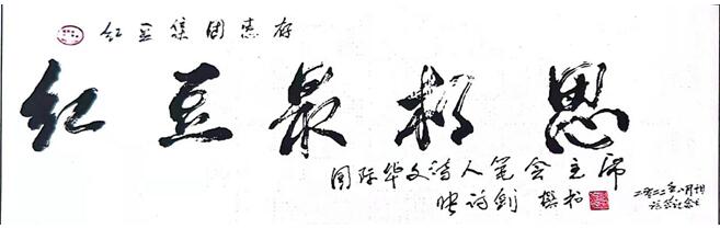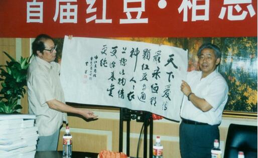 在《七夕,紅豆最相思的詩意探訪》論壇主題引導(dǎo)下,詩人們暢談紅豆愛情詩的淵源,以及對中國新詩的助推、發(fā)展的歷史作用,使中華文化傳統(tǒng)薪火相傳,在我們這一代詩人手里發(fā)揚光大,繪出獨特的、現(xiàn)代人審美的愛情詩篇。會上,北京電視臺節(jié)目主持人、詩人黃殿琴朗誦了張詩劍、桂興華、綠島寫的紅豆愛情詩歌,并展示了多位詩人等為紅豆集團寫的多幅書法,表達了友誼深情。“共同富裕產(chǎn)業(yè)報國 八方共贏輝煌華夏”是詩人黎勇先生寫給紅豆集團的書法 ,國際華文詩人筆會主席張詩劍寫給紅豆集團書法為“紅豆最相思”等。