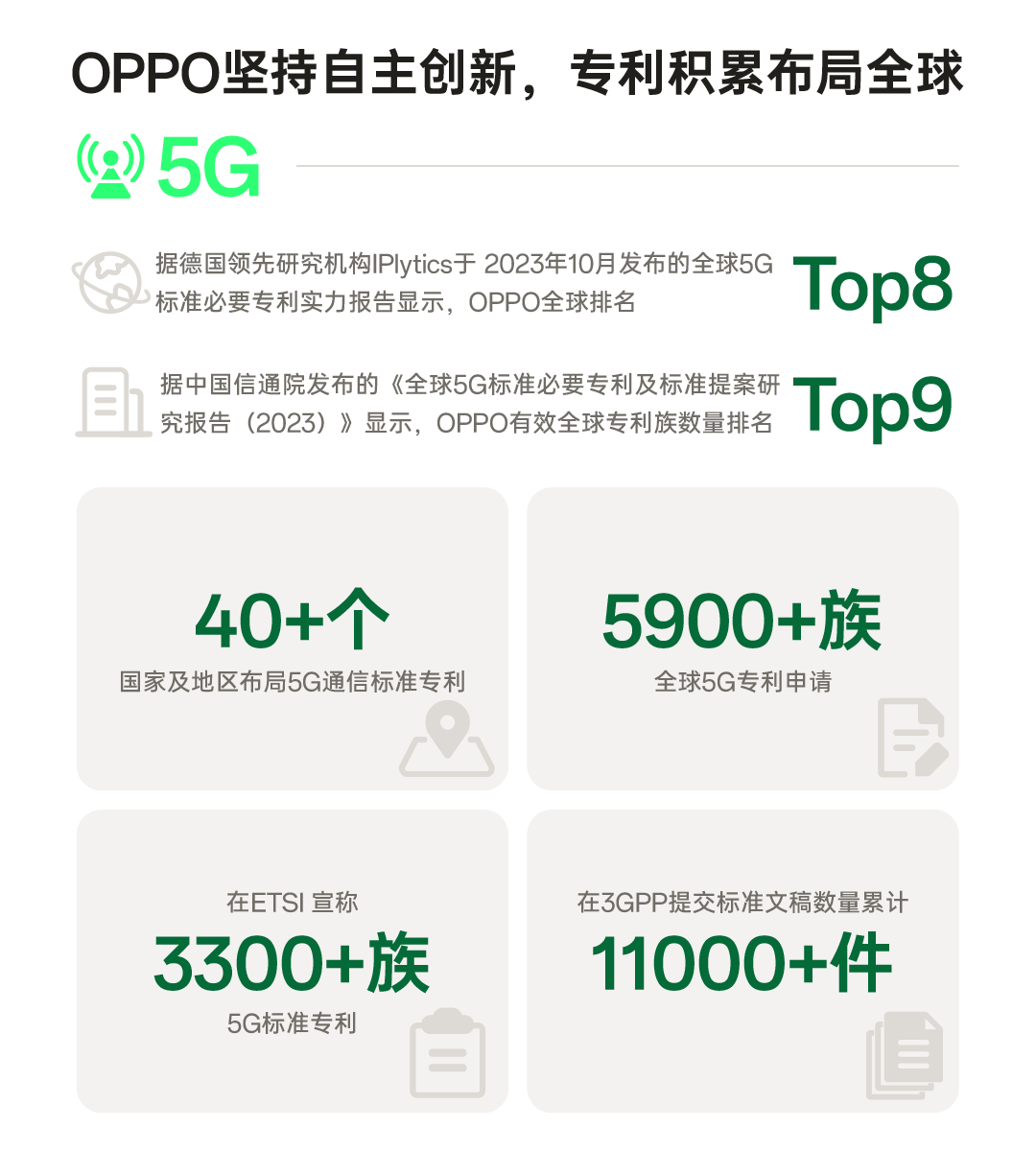 截至2023年12月31日,OPPO在全球40多個(gè)國家和地區(qū)布局5G通信標(biāo)準(zhǔn)專利,共完成5900+族全球?qū)@暾?qǐng),在ETSI聲明3300+族5G標(biāo)準(zhǔn)專利,在3GPP提交標(biāo)準(zhǔn)文稿數(shù)量累計(jì)超過11000件。根據(jù)中國信通院發(fā)布的《全球5G標(biāo)準(zhǔn)必要專利及標(biāo)準(zhǔn)提案研究報(bào)告(2023)》和IPlytics 在2023年10月發(fā)布的《全球5G標(biāo)準(zhǔn)必要專利實(shí)力報(bào)告》,OPPO 5G標(biāo)準(zhǔn)必要專利實(shí)力全球綜合排名均位居前列。