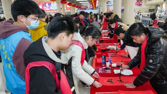 文化展示區(qū)里,傳統(tǒng)韻味與暖心服務(wù)交織成獨(dú)特風(fēng)景。鐵路部門、大連車站派出所、大連市慈善總會(huì)、大連青年書協(xié)的書法愛好者們揮毫潑墨,一幅幅春聯(lián)、一個(gè)個(gè)福字飽含美好祝愿,免費(fèi)送到旅客手中;紅包拓印體驗(yàn)更讓大家親手解鎖新春儀式感,沉浸式感受傳統(tǒng)年俗的魅力。大連北站的非遺展示區(qū)人氣爆棚:剪紙藝人指尖生花,一張張馬年主題剪紙惟妙惟肖;吹糖人、面塑攤位前,孩子們圍攏觀望,老師傅們巧手翻飛,將滾燙的糖漿、柔軟的面團(tuán)化作形態(tài)各異的小動(dòng)物,引得陣陣歡呼;五谷畫展臺(tái)則以各色谷物為料,勾勒出寓意吉祥的新春圖景,讓旅客直觀感受傳統(tǒng)技藝的匠心與溫度。