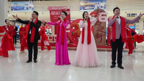 上午8時(shí)30分,大連北站候車大廳早已客流涌動(dòng),大連市總工會(huì)“心連心”藝術(shù)團(tuán)的歌舞《把福帶回家》率先登場(chǎng),歡快的旋律瞬間點(diǎn)燃現(xiàn)場(chǎng)氣氛。男聲獨(dú)唱《西部放歌》、《咱老百姓》婉轉(zhuǎn)悠揚(yáng),女聲二重唱《珊瑚頌》娓娓動(dòng)聽,最后一曲歌伴舞《走進(jìn)春天》大合唱引發(fā)全場(chǎng)共鳴,旅客們紛紛駐足鼓掌,用掌聲回應(yīng)這份冬日里的熱忱。與此同時(shí),互動(dòng)區(qū)域已熱鬧開鑼,“一馬當(dāng)先,把福帶走”活動(dòng)臺(tái)前,車站工作人員和青年志愿者引導(dǎo)旅客掃碼關(guān)注“濱城老鐵”賬號(hào),領(lǐng)取馬年限定蓋章本,打卡拍照墻“我在大連,馬上就回家”的路標(biāo)文案,道出了無(wú)數(shù)游子的心聲。