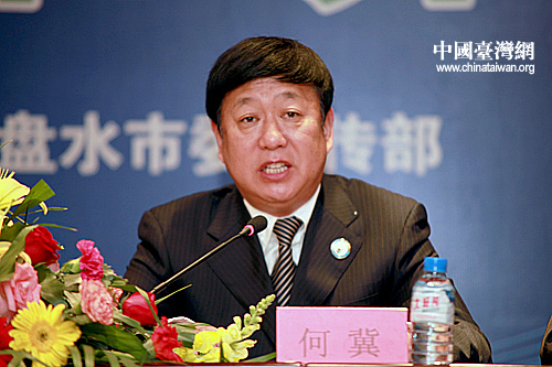 中共六盤水市委副書記何冀向網(wǎng)絡(luò)媒體記者介紹六盤水有關(guān)情況。(中國臺(tái)灣網(wǎng) 田云鵬 攝)